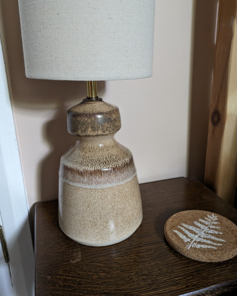 The base of the lamp has an Iden Pottery Sussex blue backstamp, which is known to be good quality stoneware. I’m not sure of its exact age. It can however be classed as Studio Pottery, which means it was handmade by artists working alone or in small groups, creating unique items or limited quantities. It took a while to find a suitable lampshade to pair with the base, I opted for a simple one from Dunelm which works nicely.