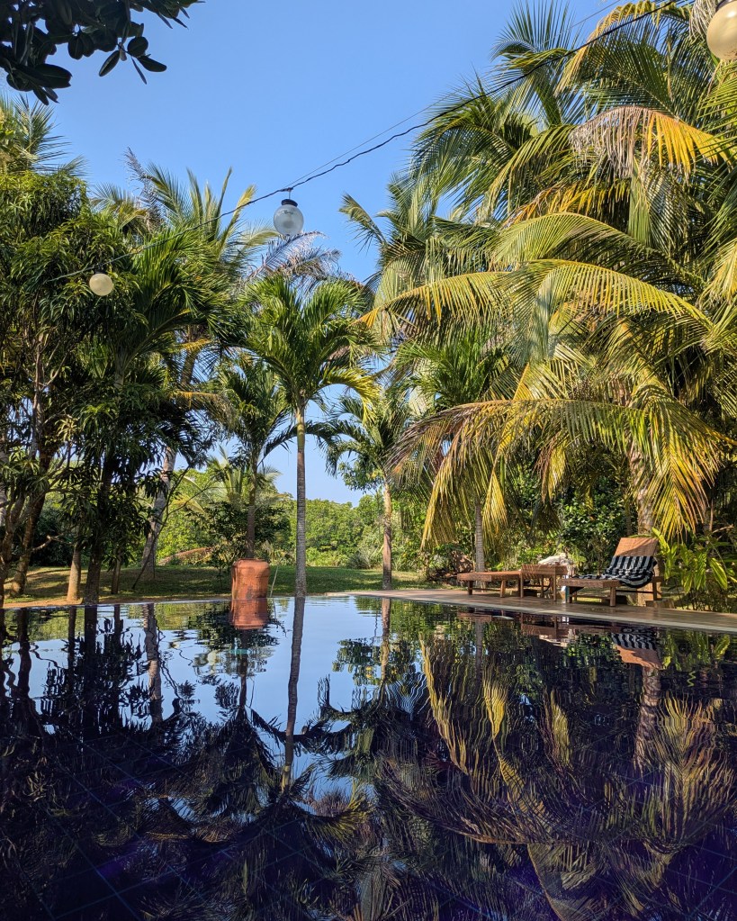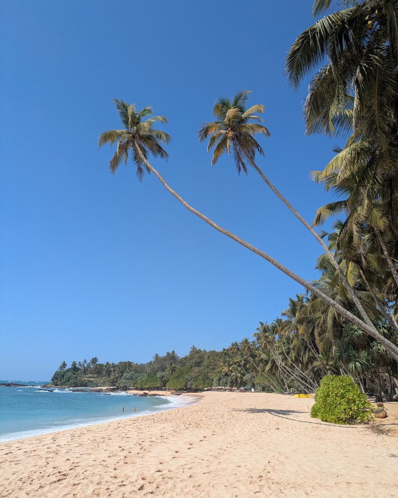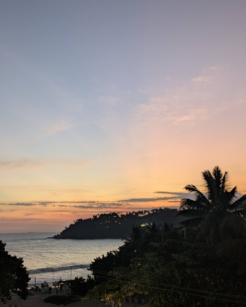 After a final dinner and breakfast with the group (and a final bit of pool time!) I bid farewell to my new friends and checked into the Celestial Inn in Mirissa which had a lovely garden. My plan for the next week was to slow down a bit, soak up the beautiful scenery and beaches, and enjoy yoga, sketching and reading. I had a lovely deep tissue massage at the tranquil Secret Root Spa and enjoyed an open-air yoga class at Jungle View. After a couple of nights in bustling Mirissa I took a one-hour taxi to quieter Tangalle, where I stayed in the calm oasis of Hidden Garden amongst the palms and the lagoon. I had a blissful time going between different beaches and the pool, trying delicious fresh fruit juice and getting through lots of books. It did take a little bit of time to adjust to a slower pace and to being solo after being on a fast-paced action-packed group tour! Leisurely al-fresco breakfasts were such a delightful way to start the day, and I went to an onsite yoga class at Hidden Garden too. It ended up being a 1-1 class which was a little intense but useful to get some specific feedback, and the teacher was a lovely German woman. It was her first time teaching in English which I would not have guessed! One day I took a tuk-tuk to Silent Beach which was definitely worthwhile, it was a beautiful large horseshoe-shaped bay lined with palms and fairly quiet. I walked all the way to the end to a café I’d saved on Google maps, The Lobster Pot (Unakuruwa). As with most beach cafés here, you can have a sunbed for free provided you buy some food or drink, and I had a delicious prawn curry for lunch.