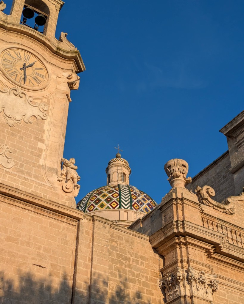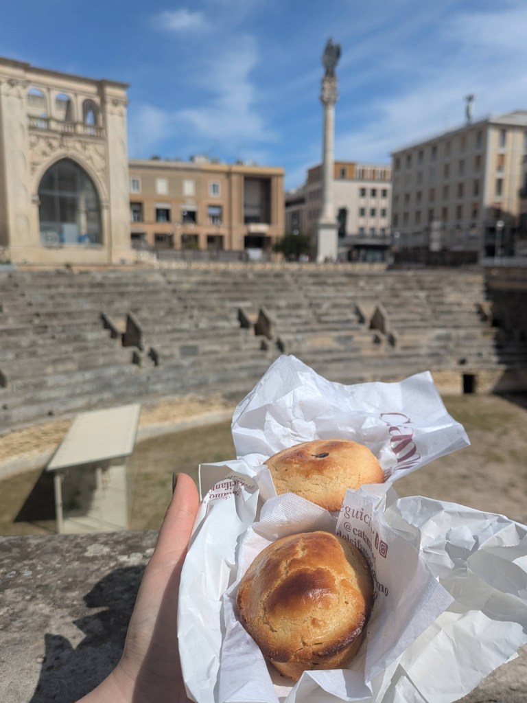 Lecce was our next destination, also known as ‘the Florence of the south’, and it was indeed a beautiful city featuring lots of ornate baroque architecture and elaborate church facades, all made from pale coloured stone. We enjoyed wandering around and rode a lift up to the bell tower of the duomo to soak it all in. We also sampled Lecce’s famous Pasticciotto, delicious warm oval-shaped shortcrust pastry filled with custard – heavenly!