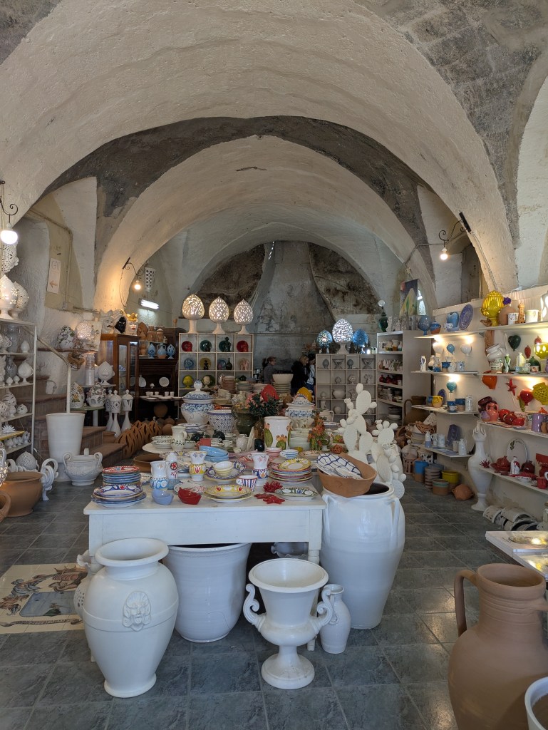 The following day we stayed more local and drove to Grottaglie, a town known for its extensive ceramics quarter. There’s a whole street lined with pottery shops and studios, and we had a delightful time browsing the wares, spotting some of the talented ceramicists at work and making some purchases ourselves. It was cool to think that people from all over Italy and beyond come here to source beautiful products for their shops direct from the makers. We then had a tasty lunch at Tutti Frutti in San Pietro in Bevagna, a colourfully decorated spot serving delicious Italian food including fresh seafood pasta and fritto misto, a great recommendation from the villa owners. We spent the afternoon relaxing at the beach – I’d love to come back in the warmer summer months! There are so many fantastic beaches in Puglia for example in Polignano a Mare where I’d love to visit another time.